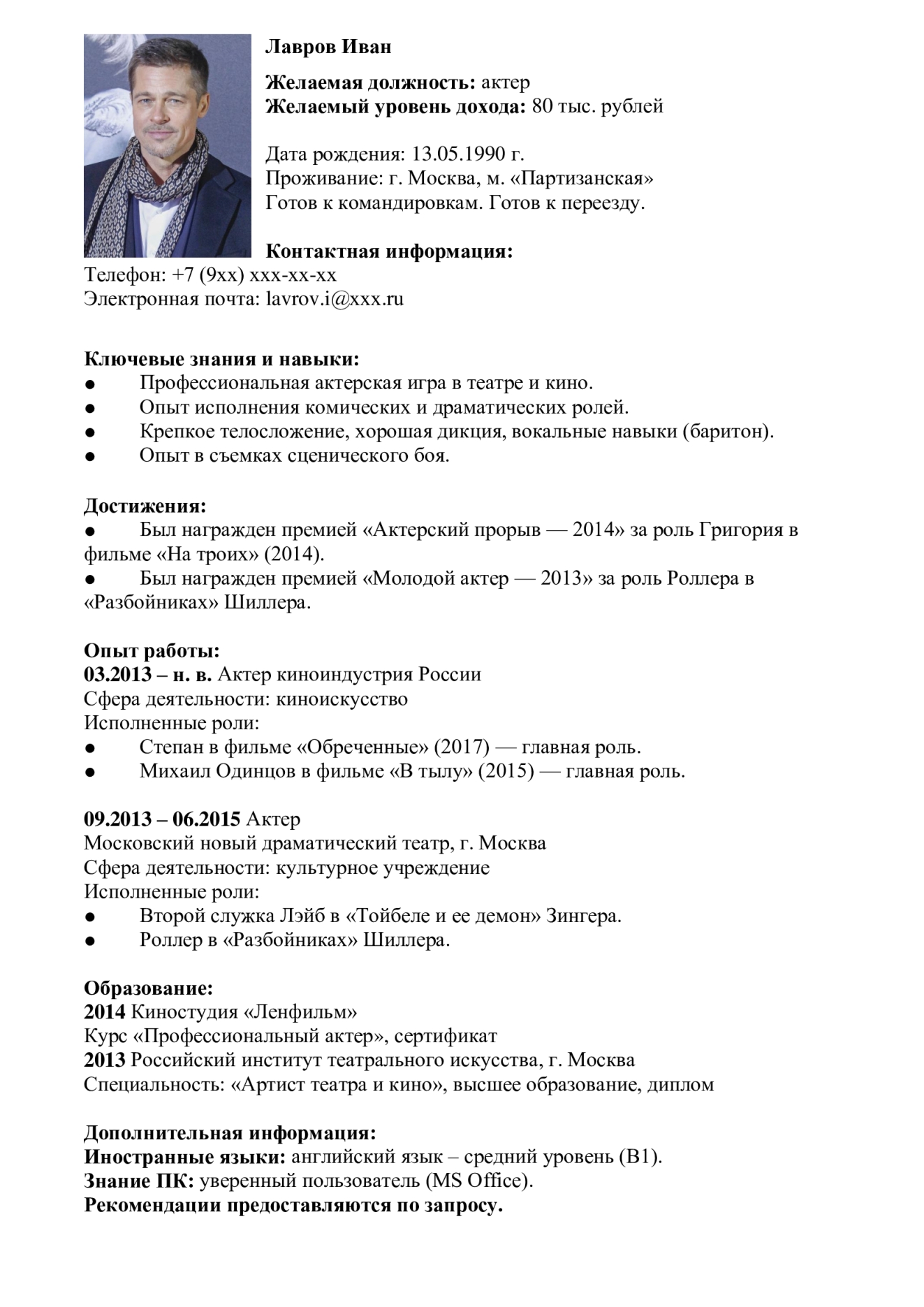 Также актеру пригодятся умение работать в команде, устойчивость к стрессам, трудолюбие, хорошее внимание, пунктуальность. Любой артист должен быть устойчив к физическим и эмоциональным нагрузкам, постоянному интересу со стороны окружающих.