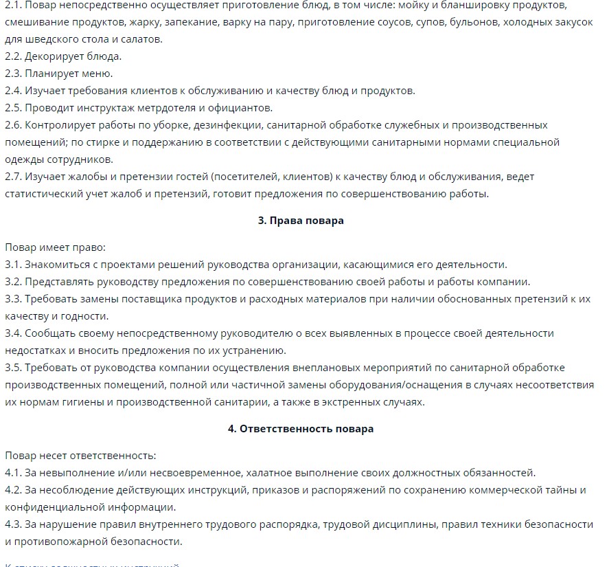 Независимо от места работы, должность повара подразумевает выполнение стандартных действий. Сотрудник принимает продукты, готовит из них блюда, реализовывает их. При этом он обязан придерживаться рецептуры и технологии производства изделий, правильно эксплуатировать оборудование, заготавливать полуфабрикаты. Также он отвечает за организацию хранения ингредиентов в соответствии с санитарно-гигиеническими нормами, их учет.