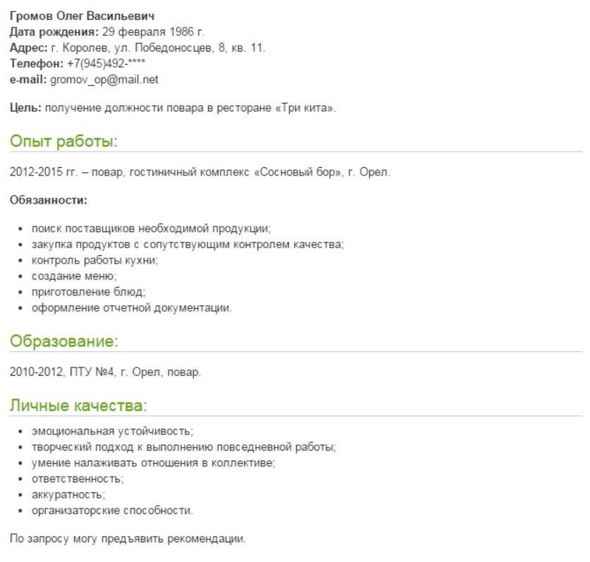 Пример резюме