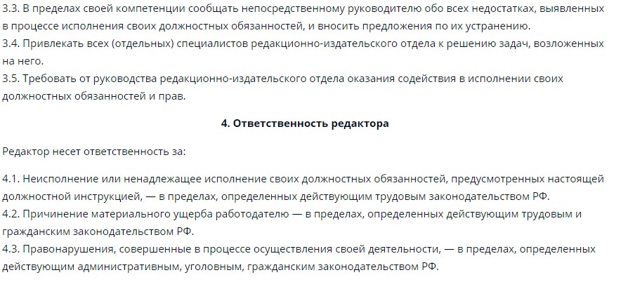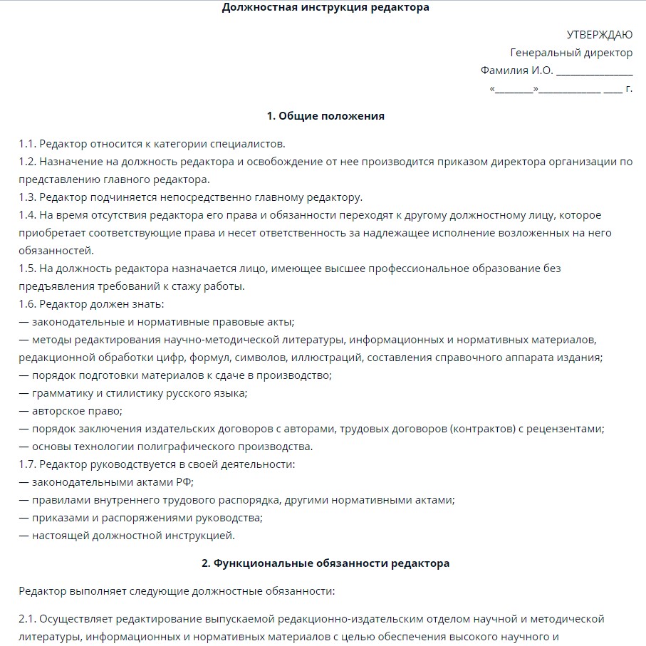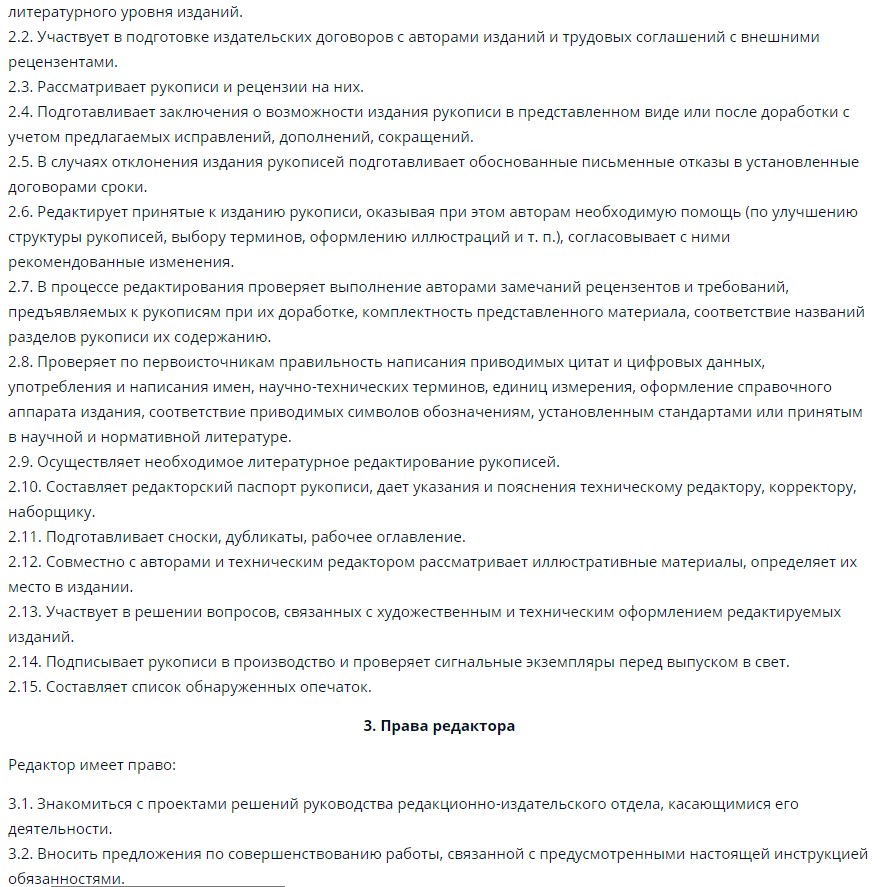 Перечень действий, которые представители специальности совершают на рабочем месте, прописывается в должностной инструкции. В зависимости от должности, места службы и особенностей ситуации редактор может работать с техническим или творческим уклоном.
