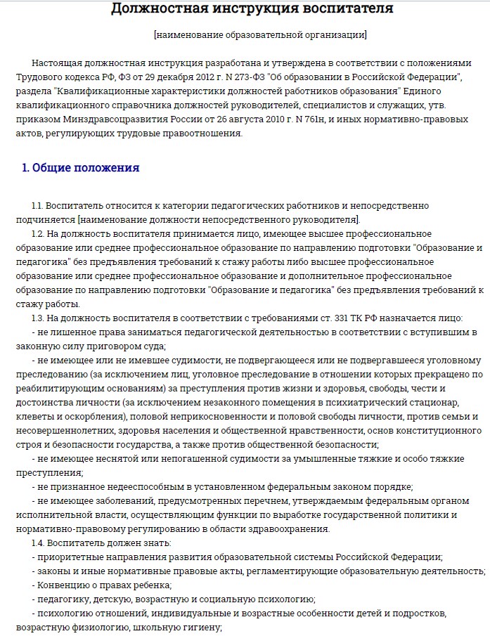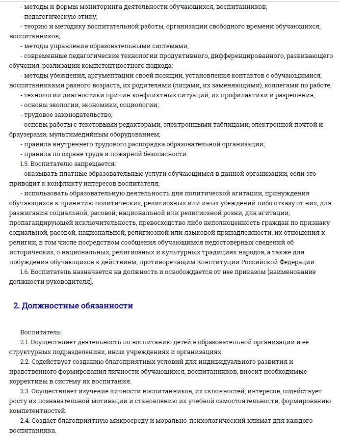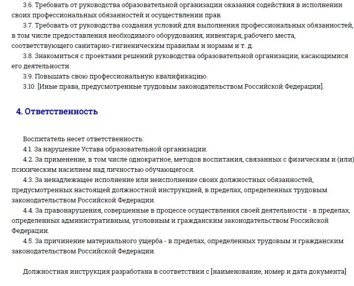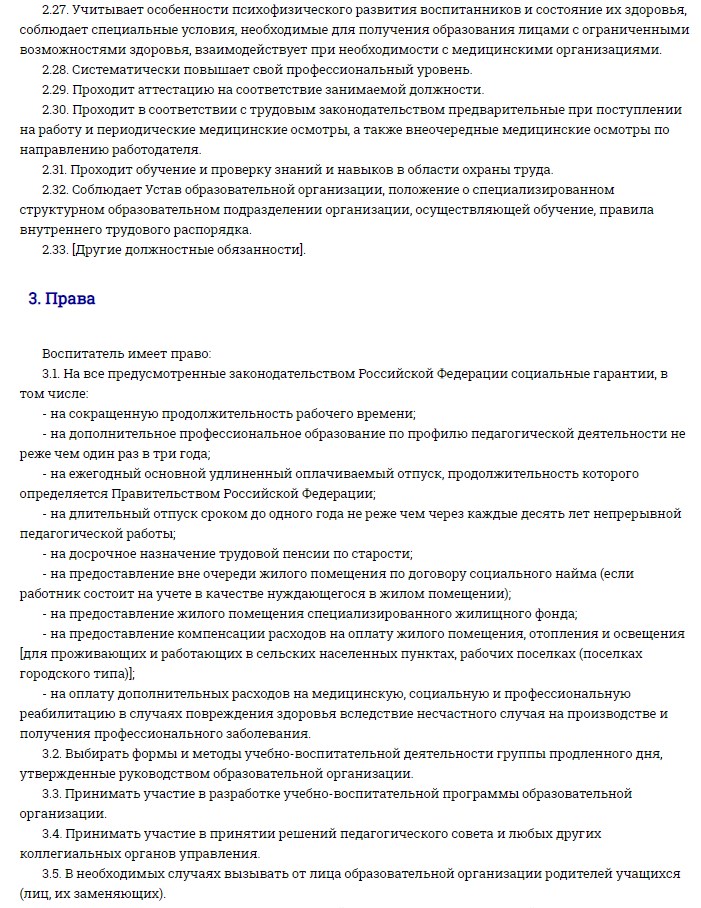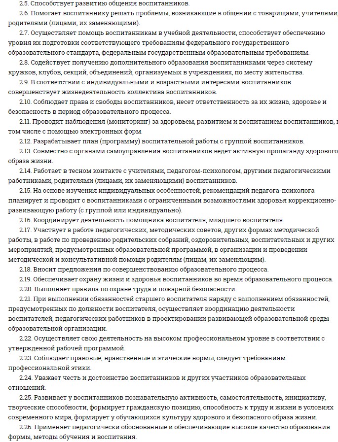 В зависимости от особенностей направления специальность педагога-воспитателя может включать дополнительные обязанности. Все эти моменты прописываются в должностной инструкции сотрудника.