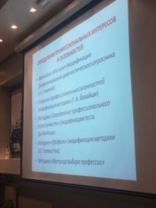 Выступают специалисты, профессионалы с огромным стажем — Николай Сергеевич Пряжников и Алексей Николаевич Гусев. Рассказывают о психодиагностике и новинках на рынке профориентации, проводят презентацию нового продукта.